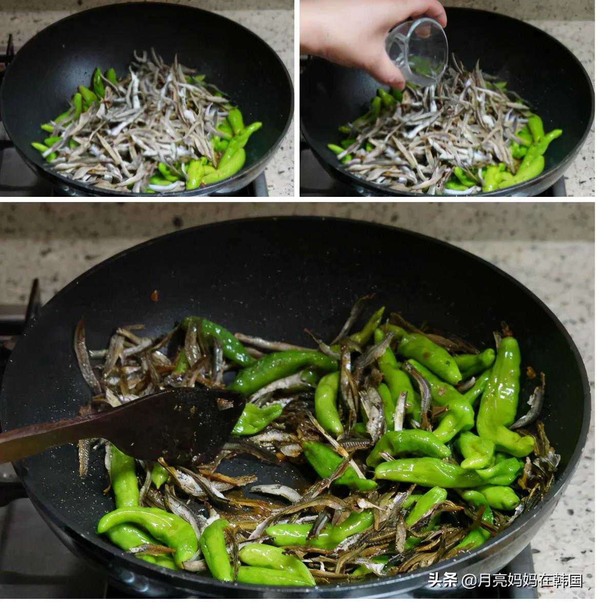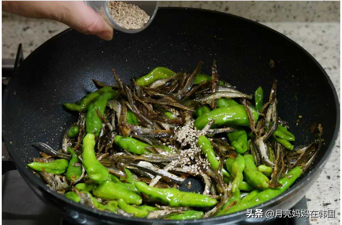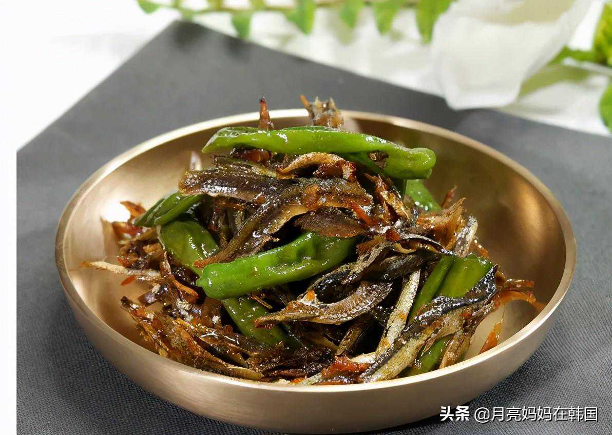 一做这道菜,我就会想起我妈妈。因为大概可能也许这是我妈妈最爱吃的一道韩国菜了。她总是说我炒的坚果炒小银鱼里面的银鱼太干了,她不喜欢。她喜欢吃稍微软一点儿的有肉的小鱼。哈哈,可能老人家了,牙齿不好。另外我婆婆每次给我送小菜时,也都会做这道菜,所以我家也还算吃得比较频繁,唯一的缺点是孩子不吃,因为稍微有点儿辣。对我这个南方人来说,这个辣度却正好。其实每次都是里面的丑椒比小鱼干先吃完,所以我还要感叹一下丑椒样子虽丑,味道却不丑。