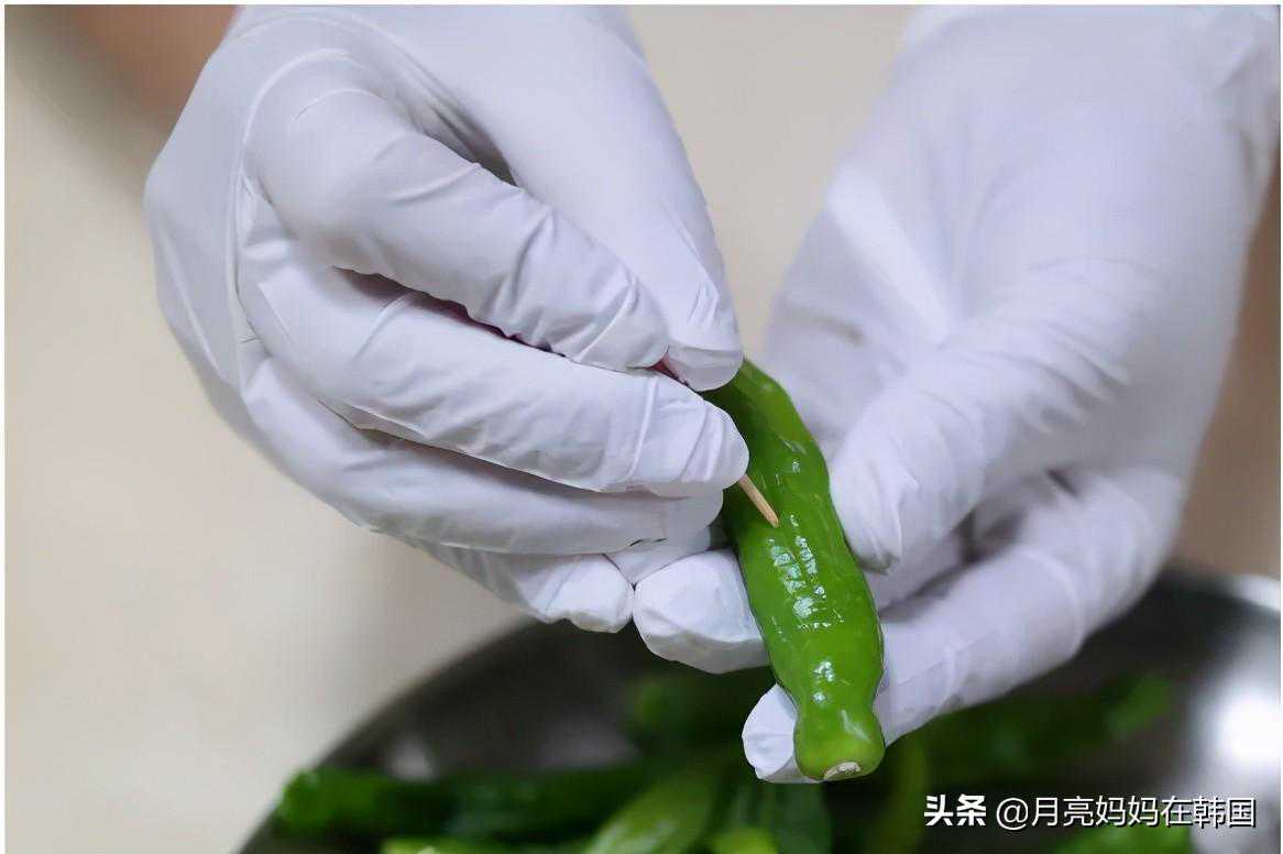 1、把丑椒洗净,每个丑椒都用牙签戳两个孔(也可以每个丑椒各切两三段),方便入味。
