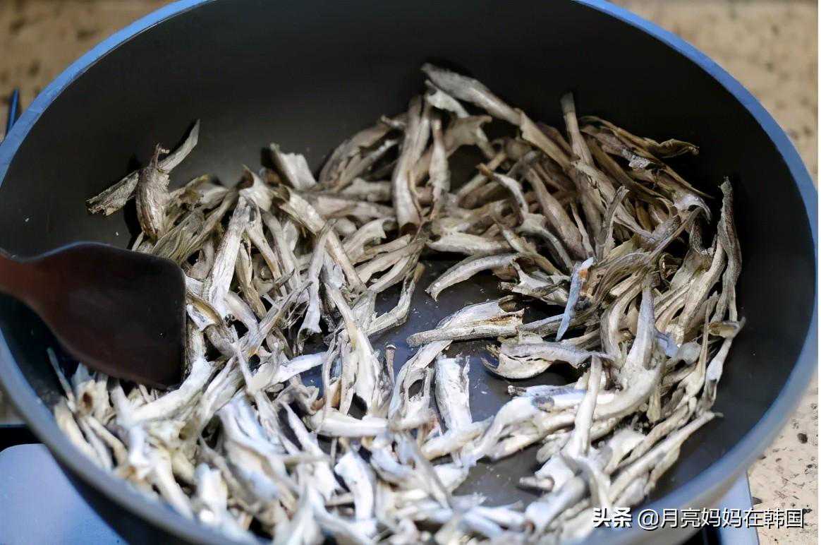2、小鱼干先用锅炒香去腥味(大号银鱼干最好去头去内脏,小号的不用去),炒出的银鱼末末不要。