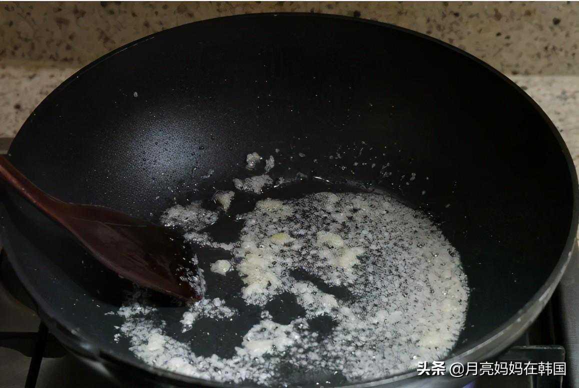 4、锅里放入食用油,大蒜末炒香后,倒入酱油和糖浆煮。