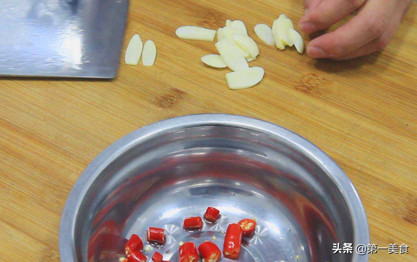 小米椒一把,切成辣椒圈,大蒜一把,切成蒜片。