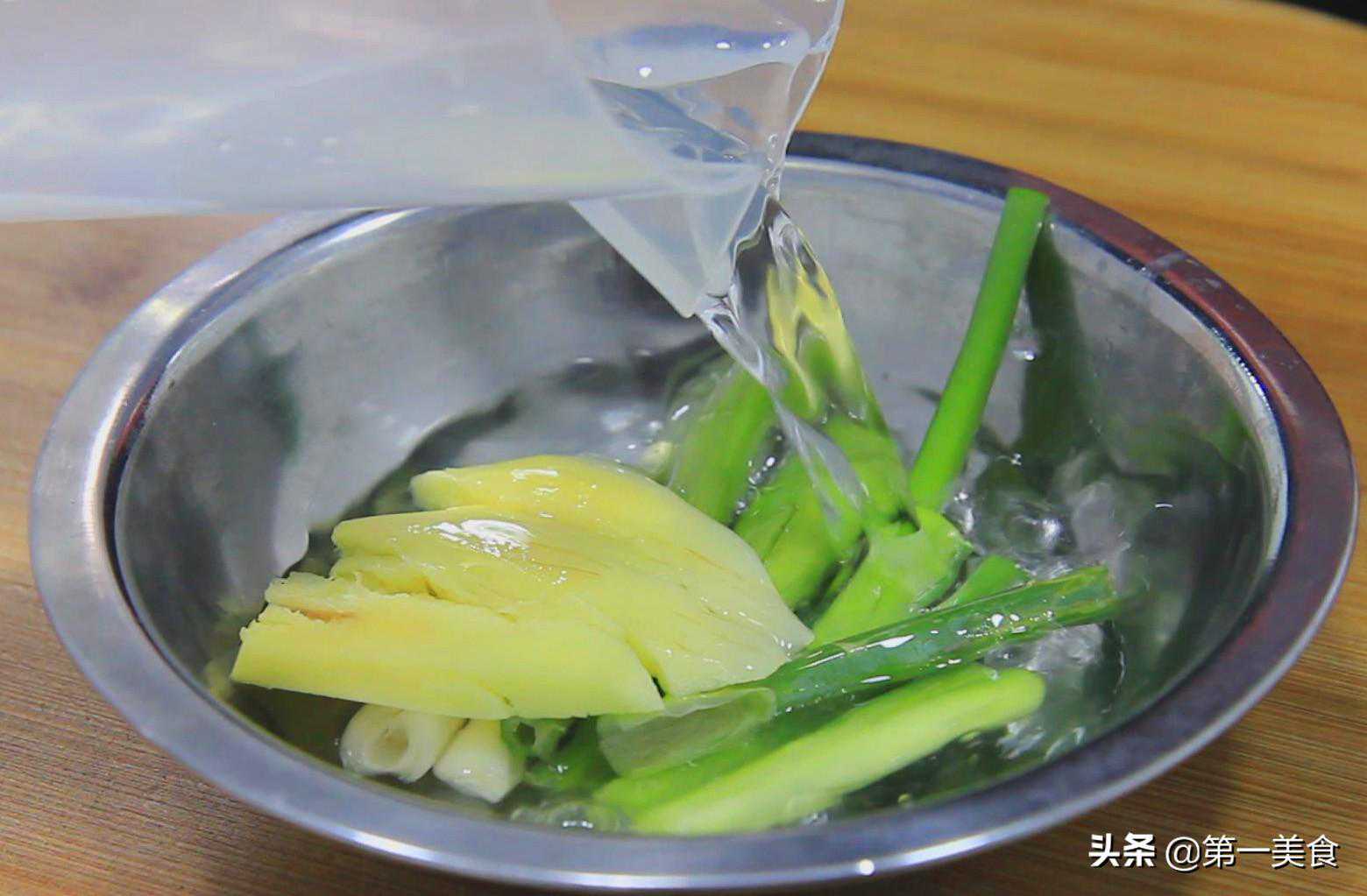 生姜一块拍散,与葱段一起放在盆中。