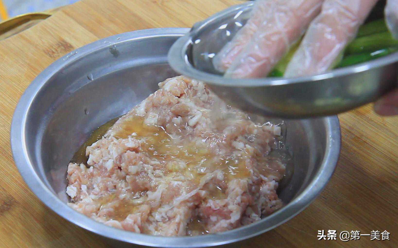肉末200克,放入食盐2克,胡椒粉2克,料酒5克,用手抓匀,顺着一个方向搅拌均匀,并摔打上劲。