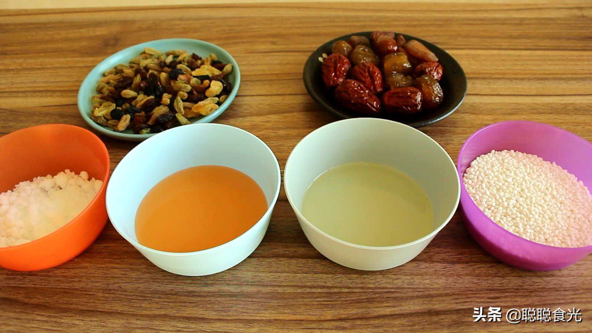 糯米,白糖,玉米油,大枣,葡萄干,各种蜜饯。