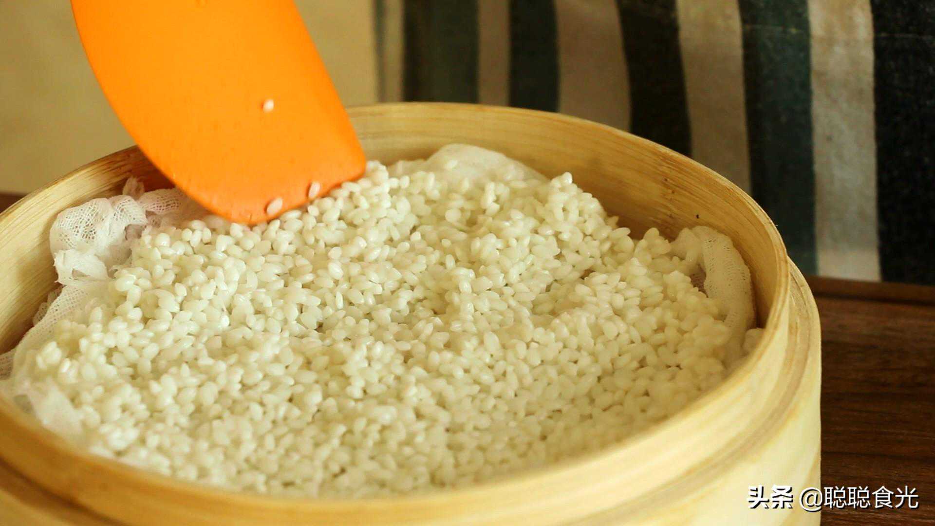 步骤一:糯米提前一夜用清水浸泡,泡到颜色发白,体积膨胀后,放到蒸锅中,蒸锅下面铺蒸布,用铲子把糯米铺均匀,盖上盖子蒸半个小时。