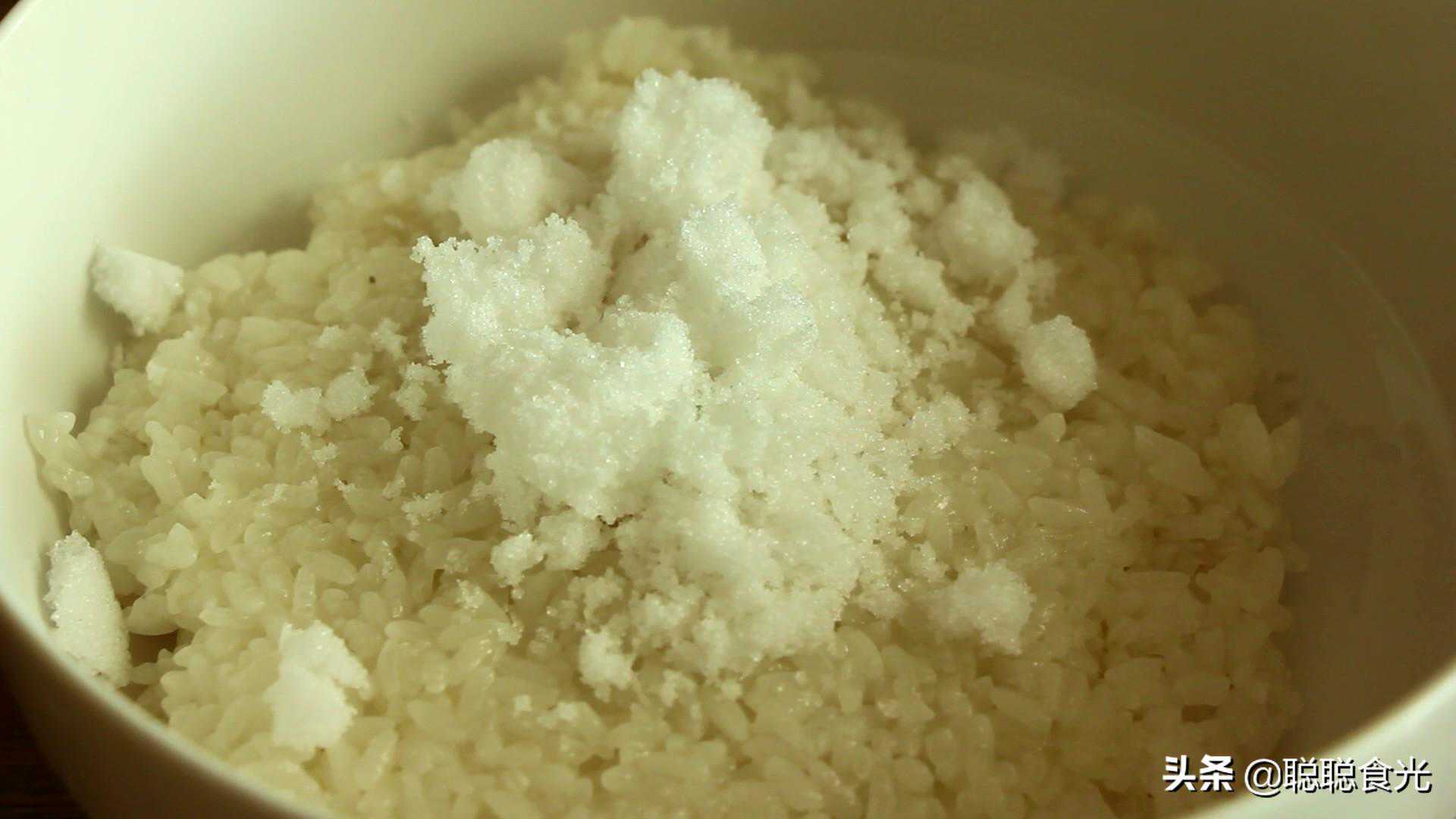 步骤三:半个小时后打开蒸锅,也可以用电饭锅煮饭键直接把糯米煮熟。把糯米饭取出来放入大碗中,加入白糖,玉米油拌匀,这个过程也可以放猪油,猪油的口感会更香,拌匀后放一旁备用。