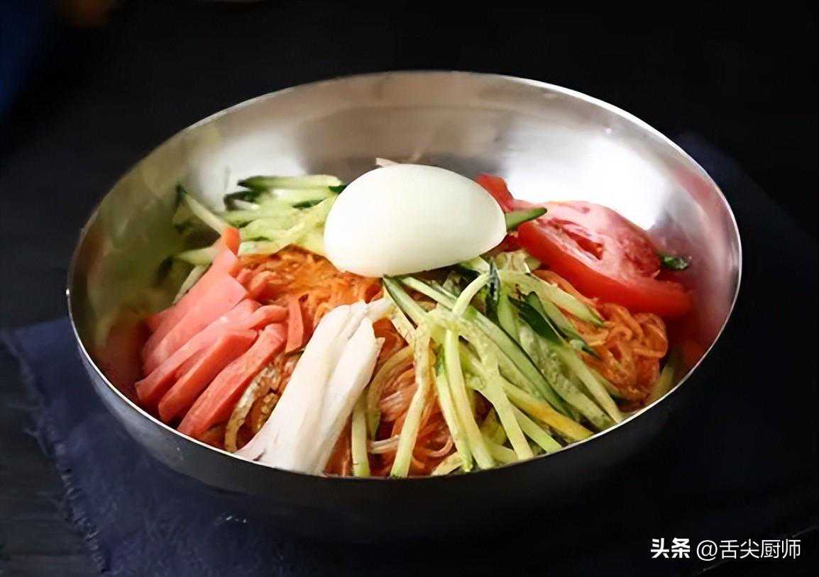 这道韩式拌冷面口感爽滑,酱汁酸辣开胃,配以丰富的配料,是夏季消暑的绝佳选择。