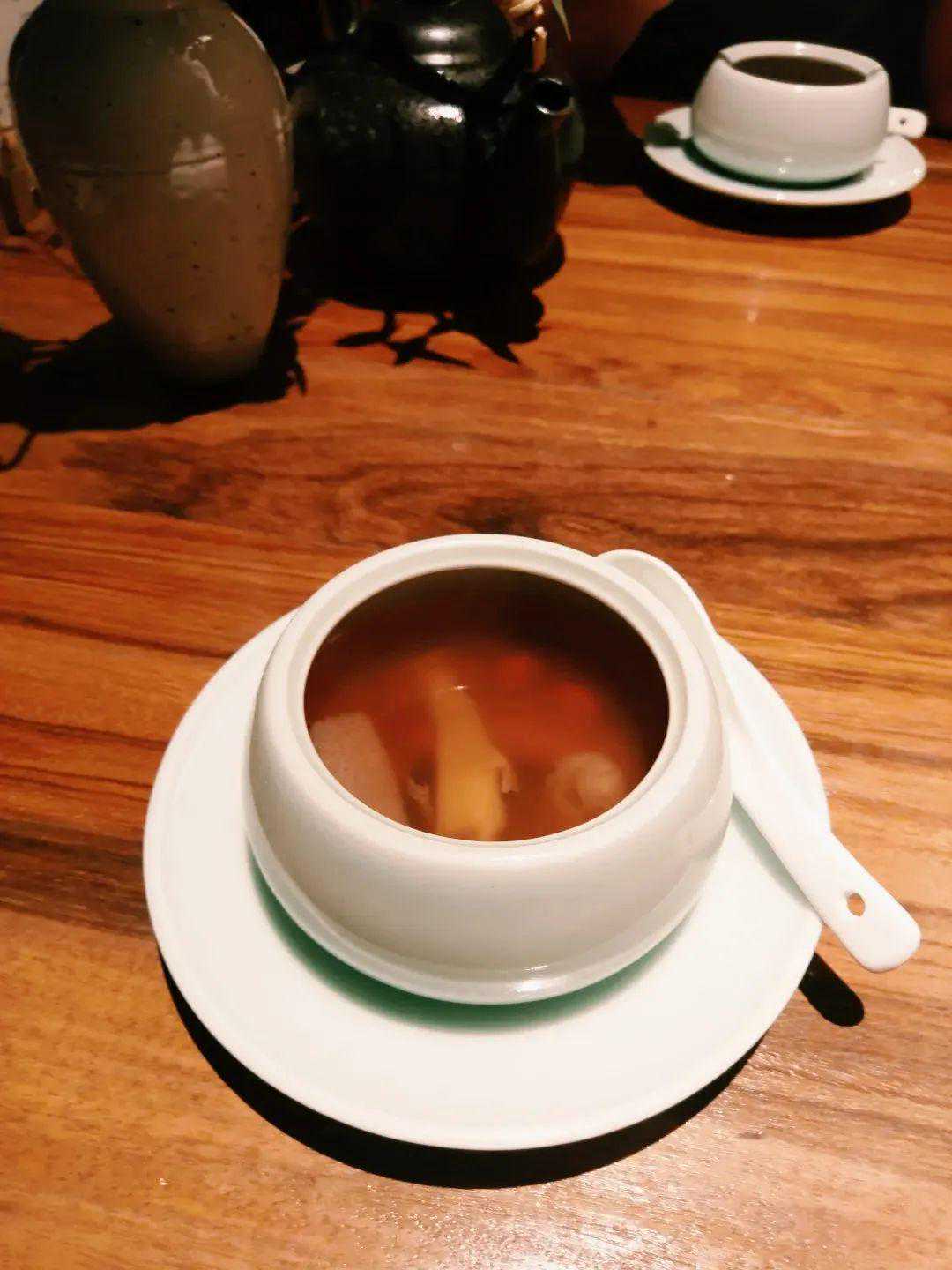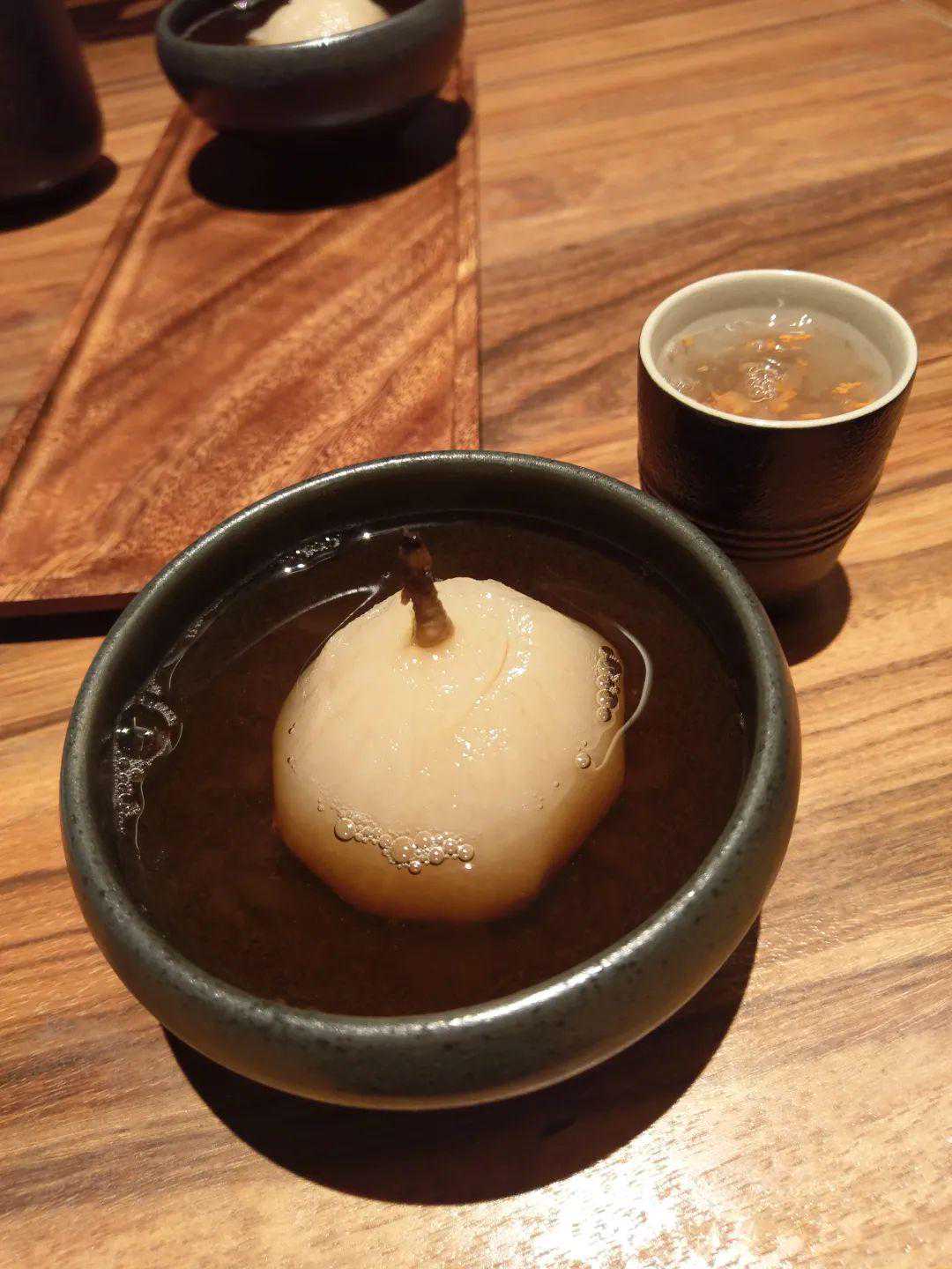 秋季也是黄豆丰收的季节,豆汁杭白菜的搭配可谓新奇。到此,这次的奇妙宴席接近尾声,以老白茶桃膠燉梨和丹桂花燕耳熱飲收尾。