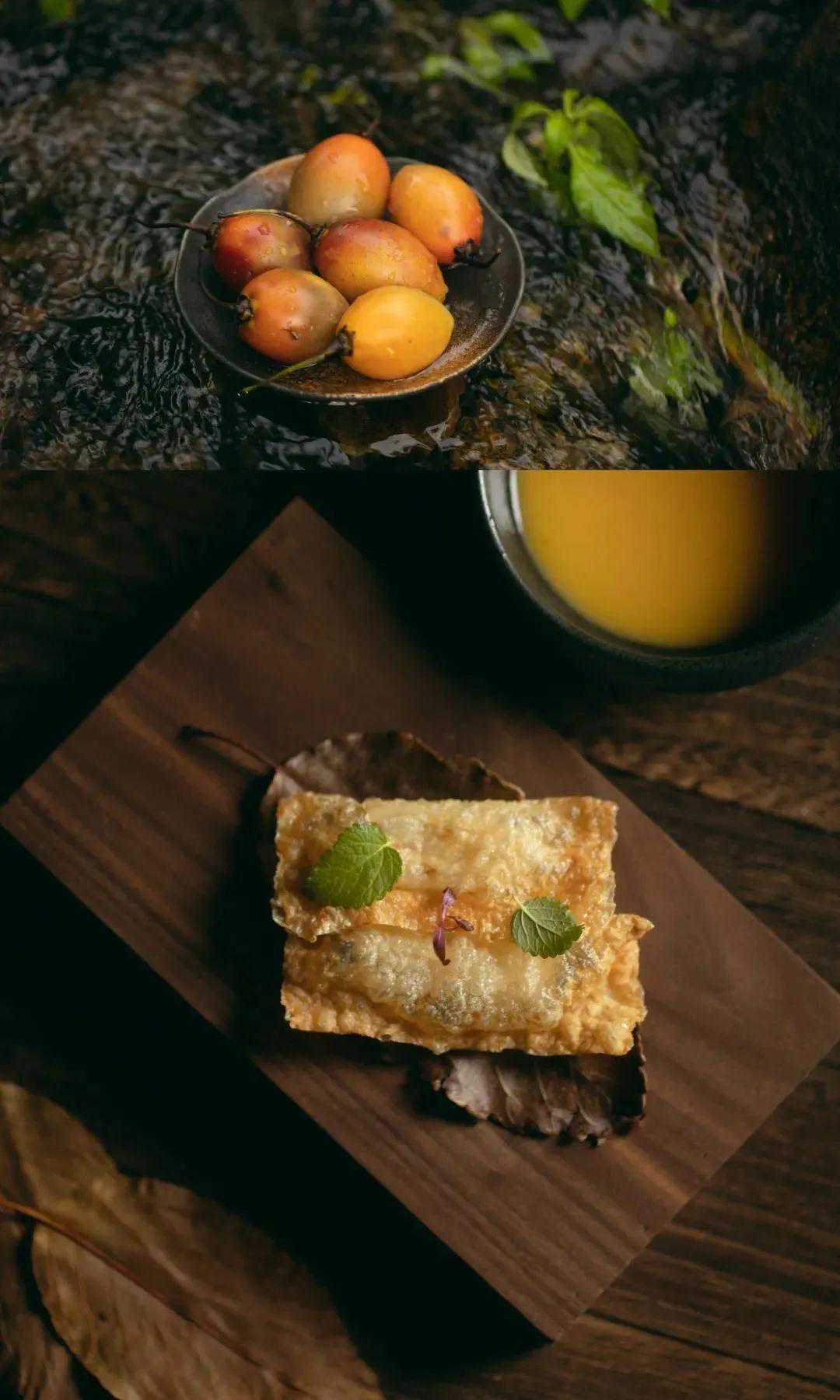 樹蕃茄酸湯浸沙葛餃子,选用了贵州独有的树番茄,是当地酸汤的主要原料。用腐衣做饺子,以香蜜草点缀,淋上酸汤,酸味也变得富有层次。