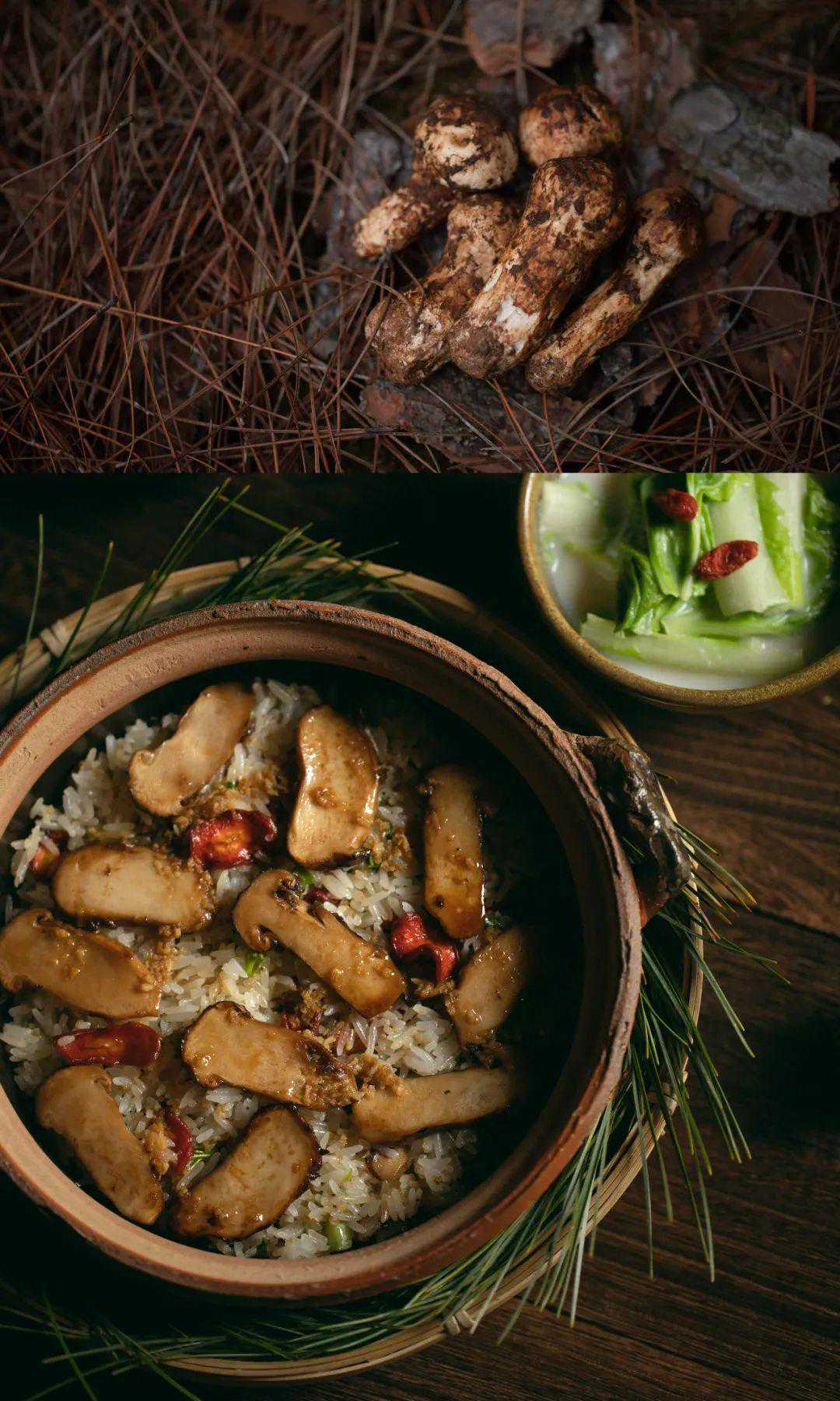 九月是松茸正肥美的季节,松茸切片煎香,放于饭面制成炊饭,再拌入杂菌酱,满口鲜香。
