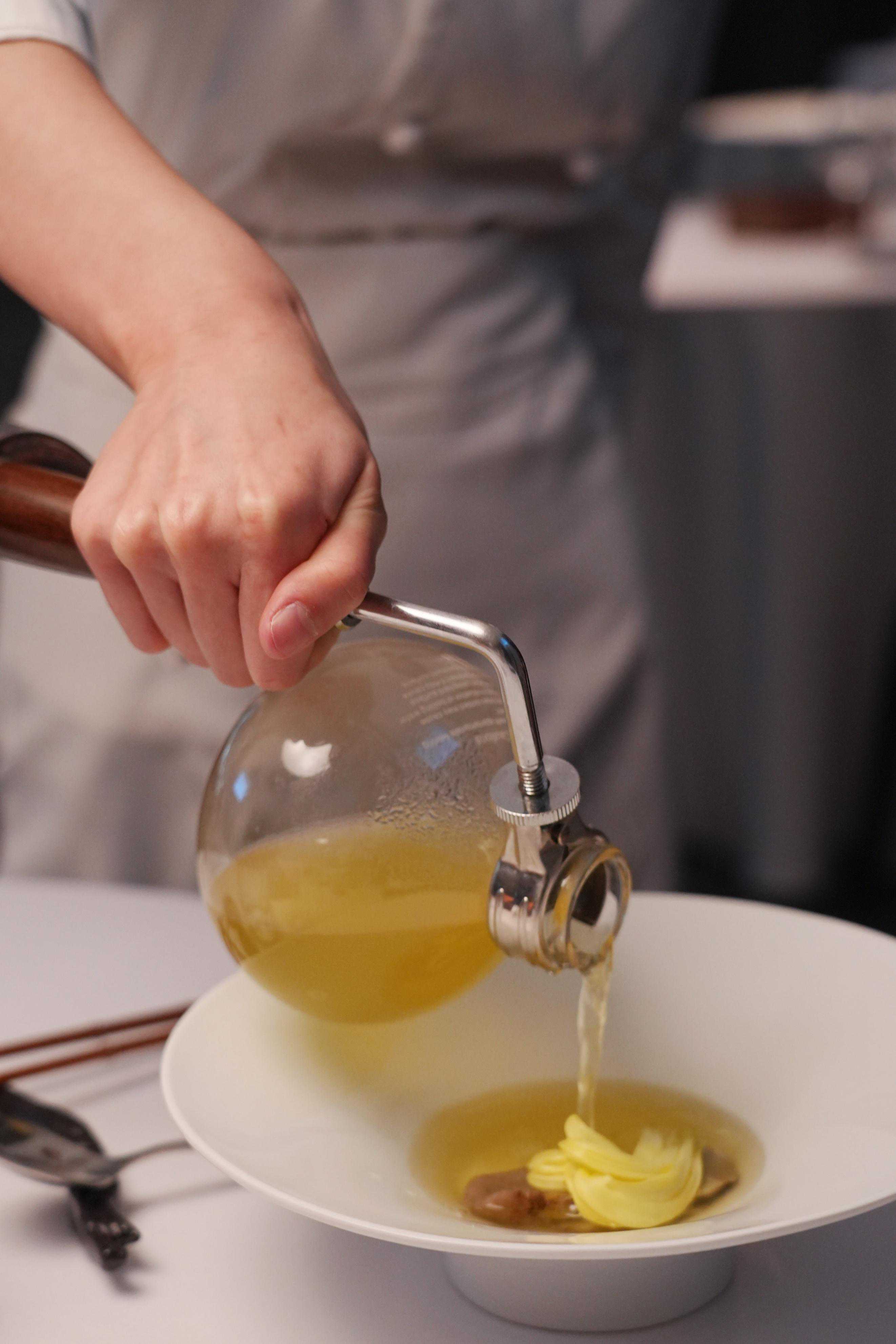这道菜很有意思,是在桌上现做的,像做实验似的。汤是通过虹吸的方式,萃取菊花的味道。