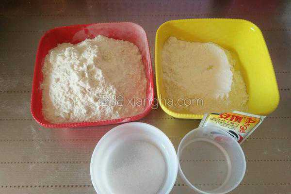 11、我们来做辅助面团,面粉倒在面案上,用手把一个我,把糖倒进去。