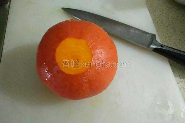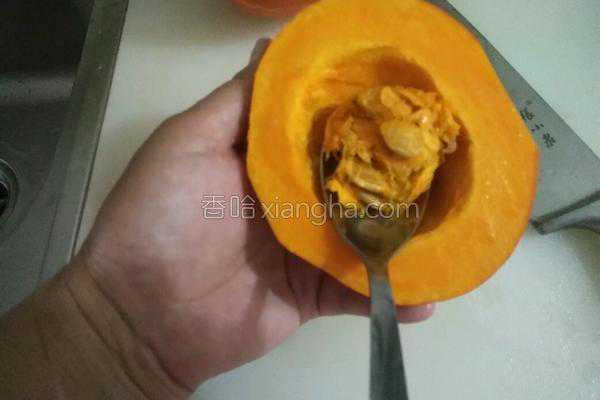 3、用刀一切两半,并用勺子玩掉南瓜瓤。