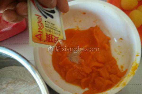 7、打好的南瓜泥不烫手时,加入酵母粉并拌匀。
