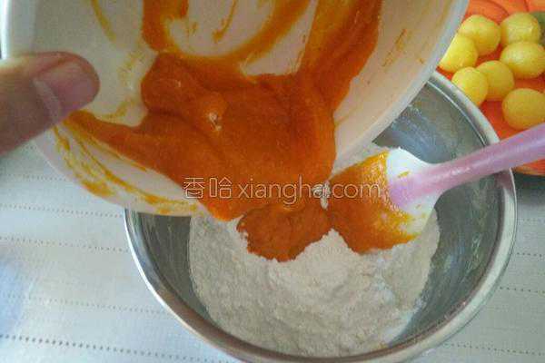 8、拌好的南瓜泥倒入装有面粉的容器里。