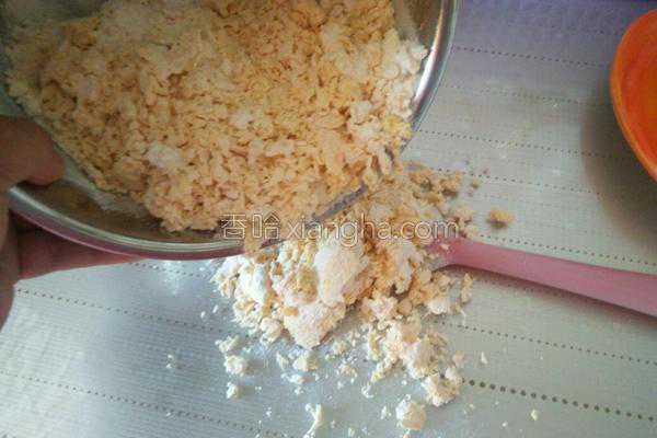 9、用筷子或者是刮刀拌成花絮状,在倒在面案上。