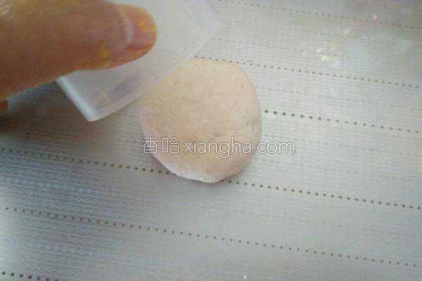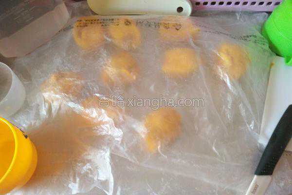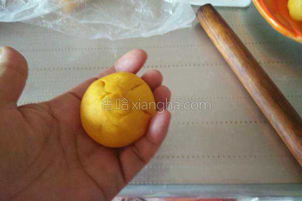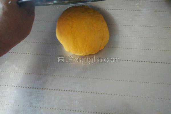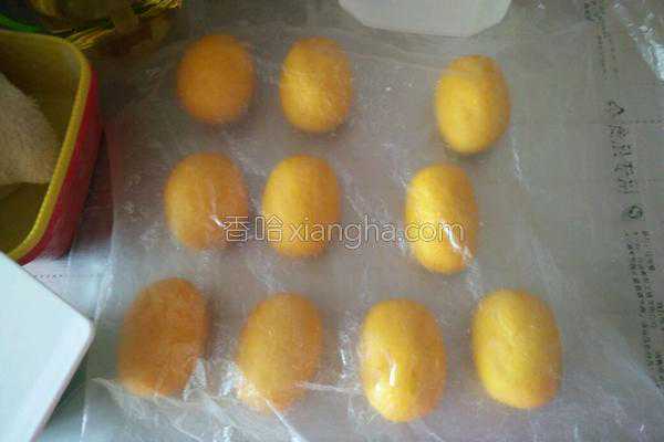 15、取醒发好的南瓜面团,分割成10份,并用保鲜膜包好,以免水份蒸发。
