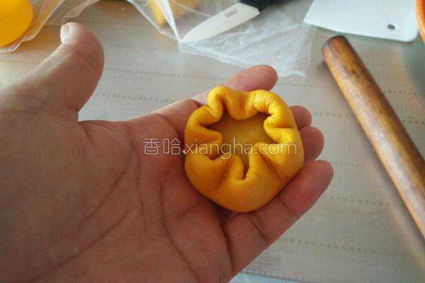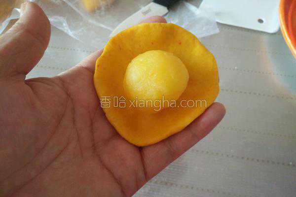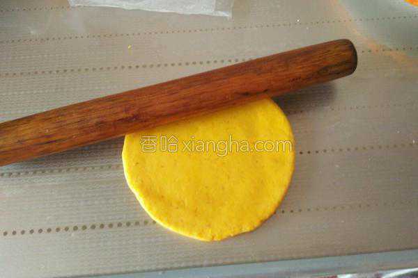 16、取一个南瓜面剂子,用擀面杖擀成圆形,边薄中间后。