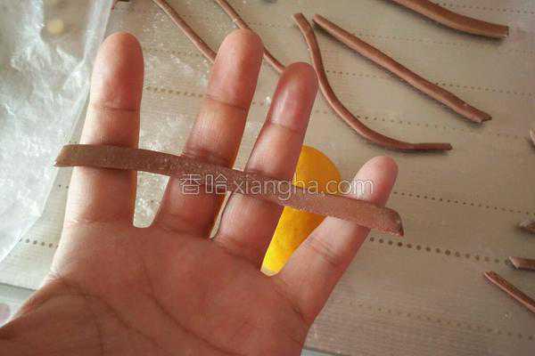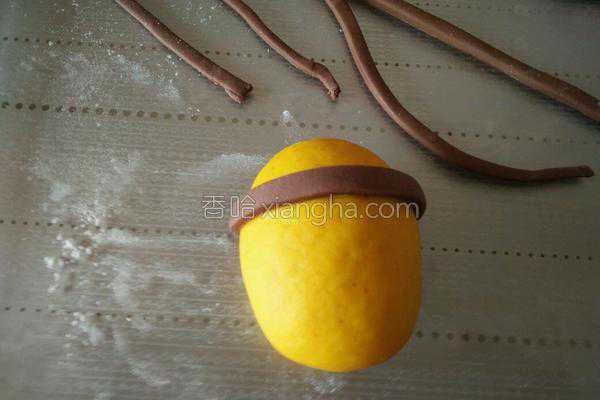 30、取一个细的可可条,沾点水并围绕白色圆面团一圈。