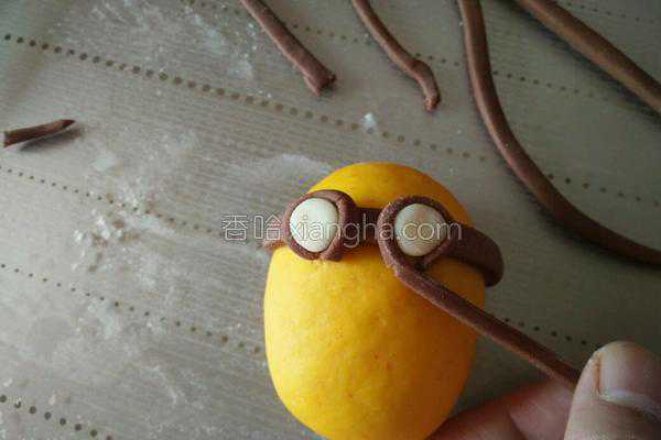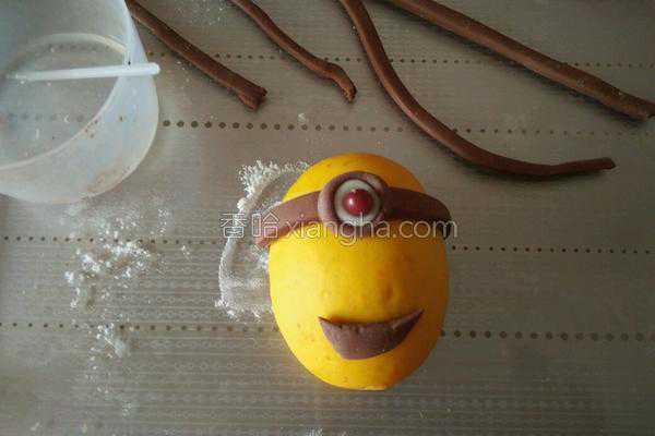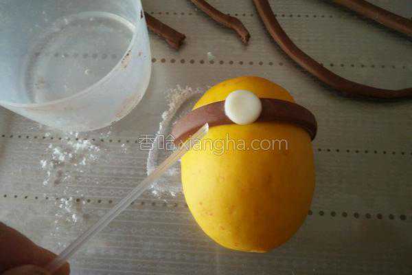 27、用手沾点水在宽条上,安装在小黄人面胚上半部分。