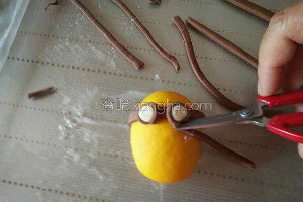 32、按上嘴,并用红小豆沾点水按上眼睛。