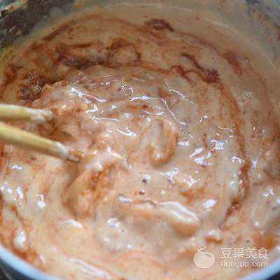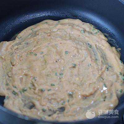 2、面粉+鸡蛋+水+糖搅拌成没有干粉的糊状。(加糖能题鲜喔,如果你不想加也不强求)
