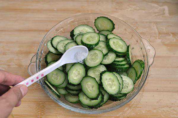 把黄瓜片盛到小盆里,放少许精盐,腌渍20分钟杀水。