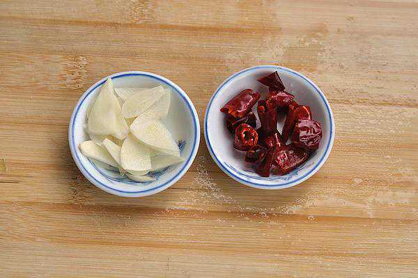 大蒜切薄片、红椒去籽切段。