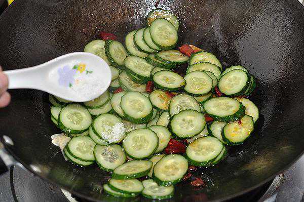 倒入控净水的黄瓜片,放入1/2汤匙白糖,翻炒均匀即可。