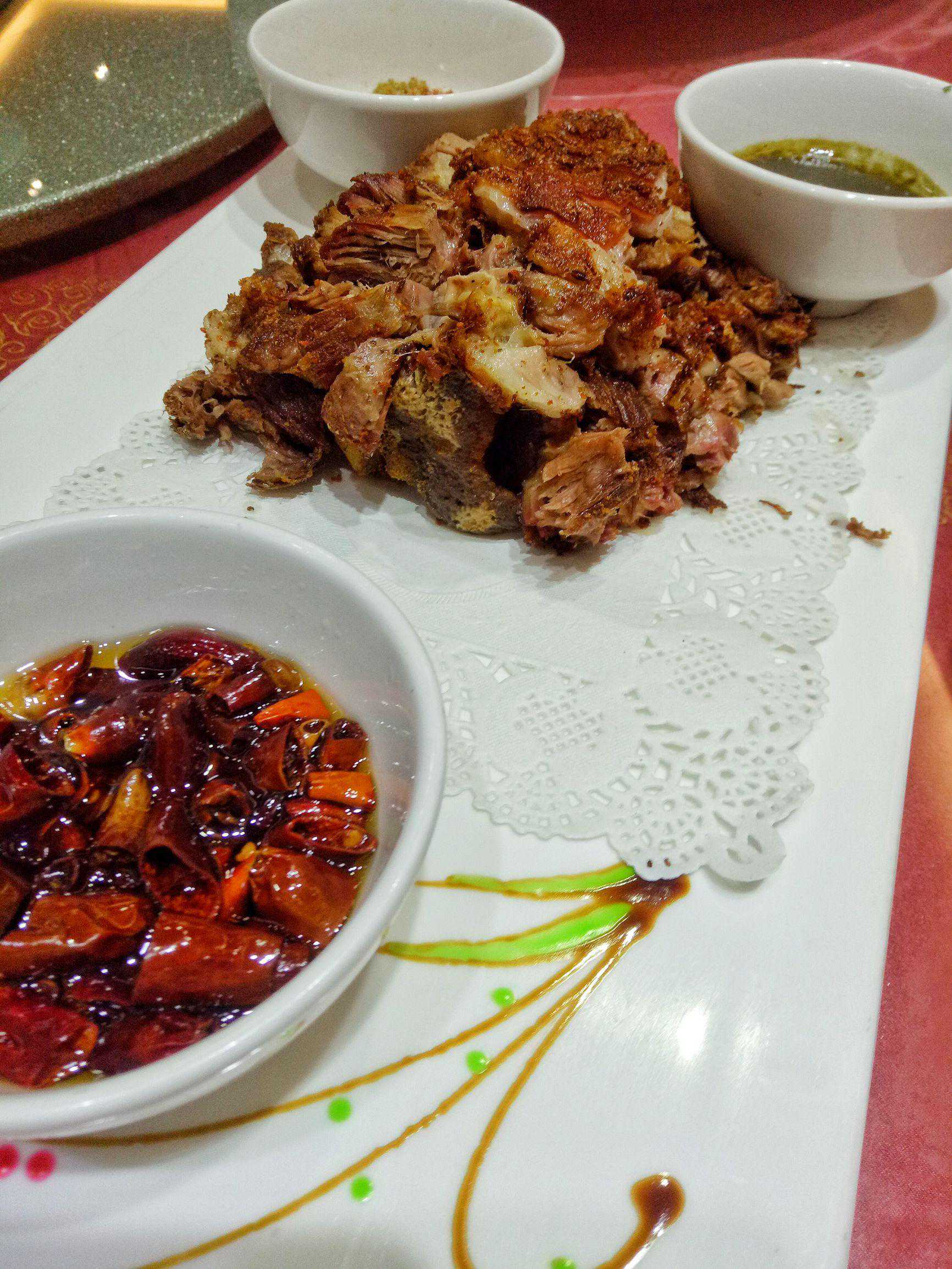 老北京烧羊肉——从制汤,紧肉、煮肉、煨肉,这羊肉处理就需要几道工序,最终要达到这外酥里嫩的口感,这最后一道炸也是十分考究。紫玉烧羊肉,肉质好,吃到口里正经的羊肉味道,却不腥膻只觉得肉香,配上偏甜口的酱汁,肥美焦香。