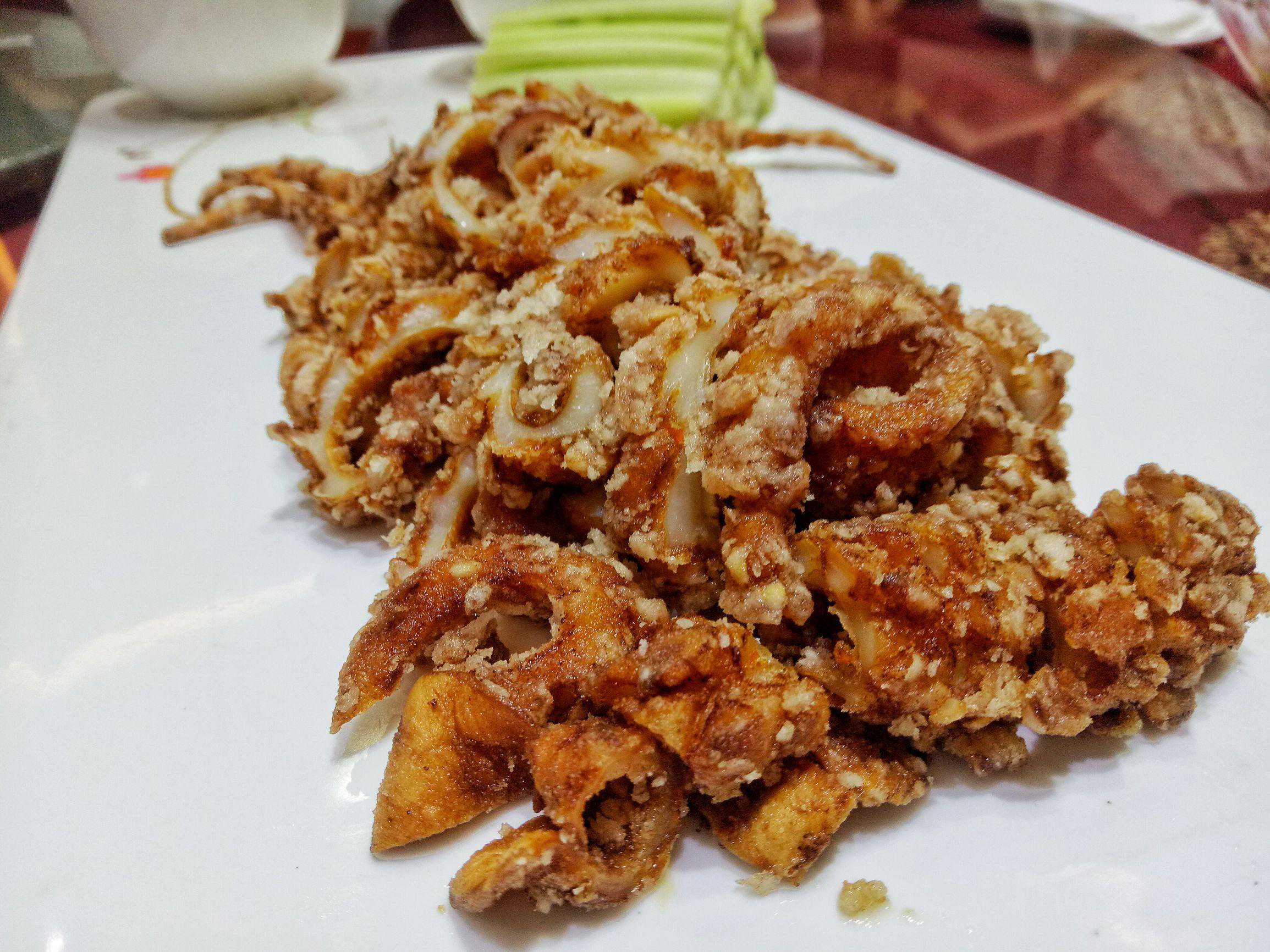大鱿鱼油炸的酥脆金黄,配上咸辣两种酱汁,花枝招展海之味!