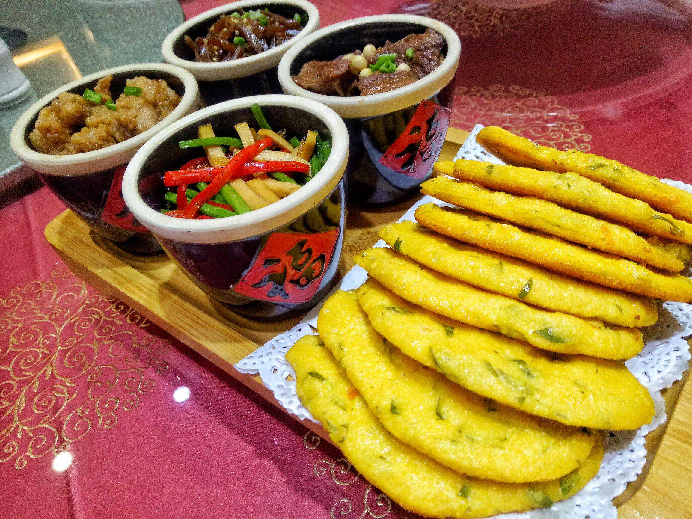 金黄的玉米饼子,配上炸酥肉、卤牛肉、炒香干、酱咸菜,农家的饭菜香,粗粮也健康!