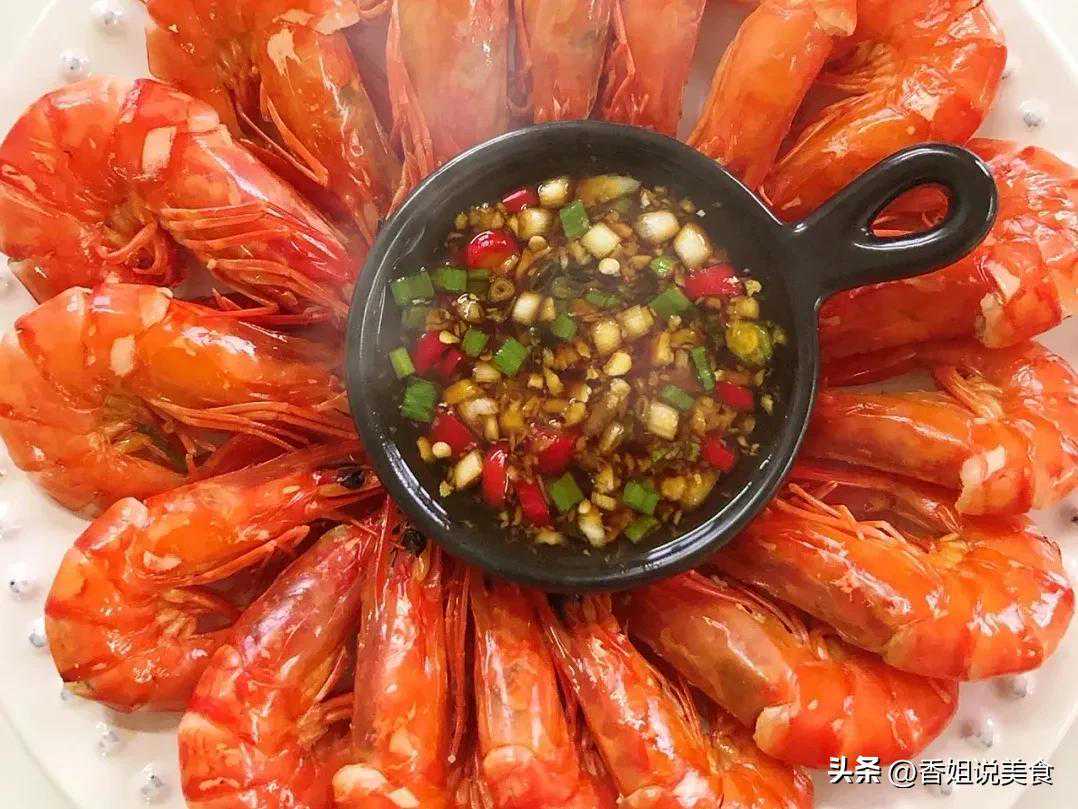 3、虾煮至变色,就可以捞起来装入盘中,摆放好。配上酱汁即可开吃了。