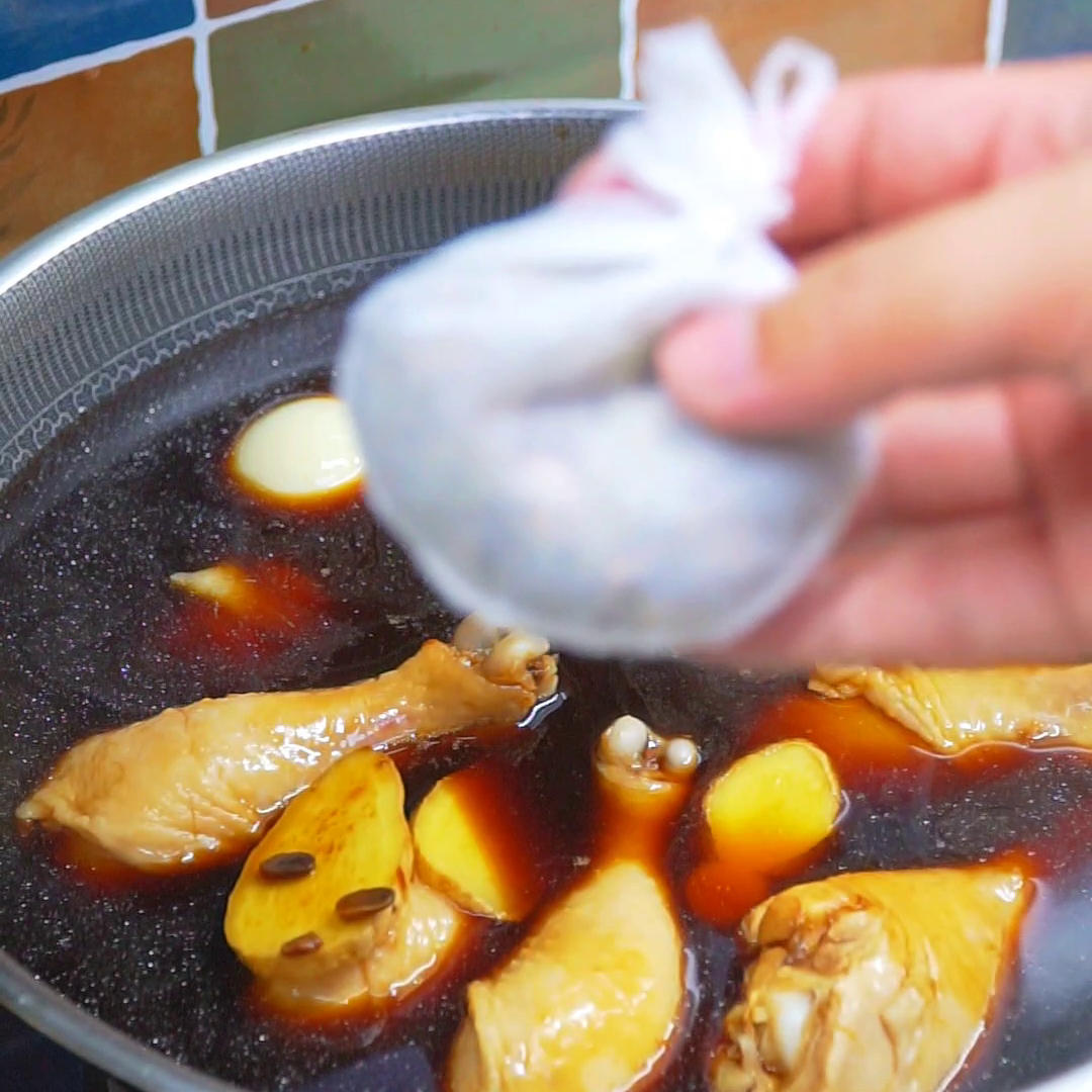 ·将鸡腿捞出,放入锅中,加入姜片、生抽、老抽、黄豆酱、盐和鸡精,再加入清水没过鸡腿。