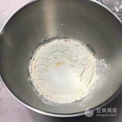 2、先液体再粉状放入厨师机,后油法揉面,直到充分扩展状态