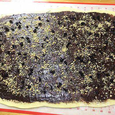 14、撒上花生碎,蔓越莓干,压一压,一会卷的时候不容易掉碎下来
