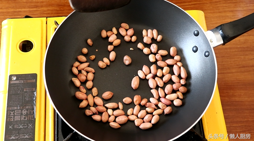 锅内不用放油,倒入花生米翻炒,炒至花生米熟后就可以出锅了。(炒花生米的时候一定要掌握好火候,火不要太大,太大了花生米容易糊。用锅炒出来的花生米受热不是很均匀,容易黑一块白一块的,这是很正常的,怕不好看可以用微波炉或者烤箱烤。)