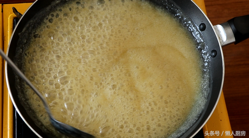 待糖稀熬到浓稠(如何辨别糖稀浓稠:舀一勺糖稀会粘在勺子上,然后往下倒的时候,呈流水状就可以了。)