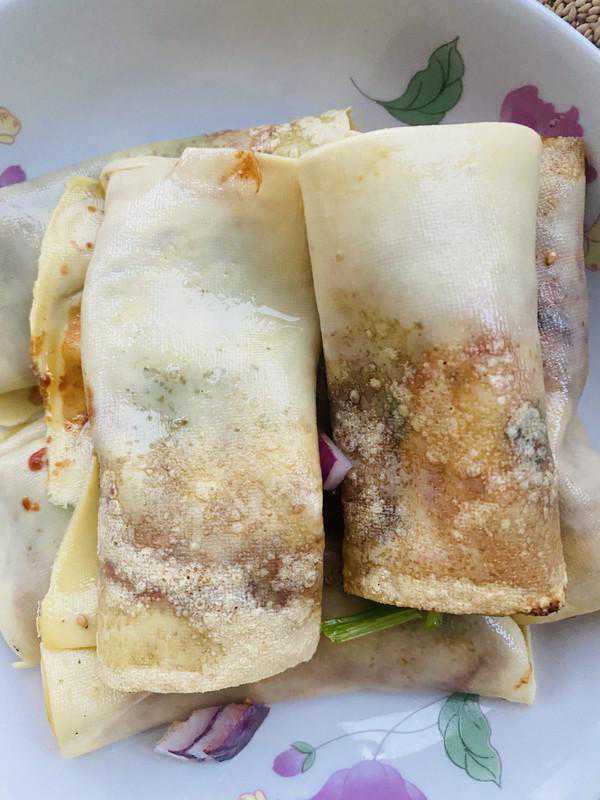 4、放上洋葱和香菜,家里香菜不多了,所以放的少了些,可以根据个人喜好选择多放点菜,然后把豆皮卷起装盘即可