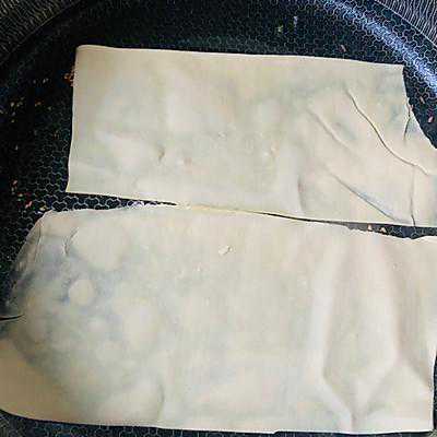 1、一张干豆皮分两份或者四份都可以,锅内放少许油,油温热,放入豆皮,锅调成小火