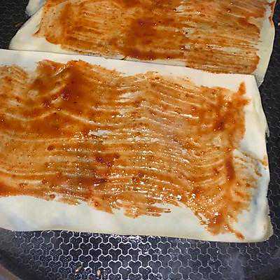 2、刷自己调好的酱汁,根据个人口味,酱汁可以自己安排,我喜欢辣一点的辣酱多放,蒜蓉酱少放了一些