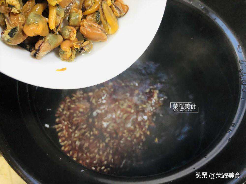 3.接着取一个大的砂锅,加入一半的清水,然后把赤小豆、陈皮、淡菜先煮个10分钟,让它们析出营养。赤小豆跟红豆不同,赤小豆稍微煮十来分钟便会软了。淡菜本来含有一些咸鲜味,因此这道汤是可以不加任何调味料的,当然,这也是要看淡菜的用量。而陈皮也是需要煮十来分钟,煮出味道来,让汤品的口感更甘醇。