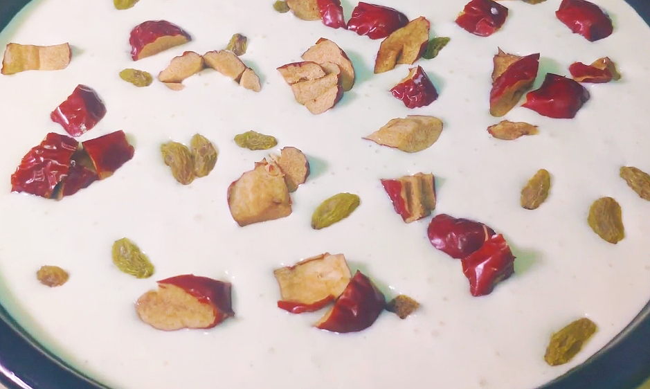 5.发酵好了之后,我们需要用勺子搅拌一下,将里面的气体赶走,然后我们准备一个八寸大的蒸盘,在上面刷刷刷的食用油,将发酵好的米浆倒入蒸盘中,然后在表面撒上切好的红枣碎,自己葡萄干就好啦!
