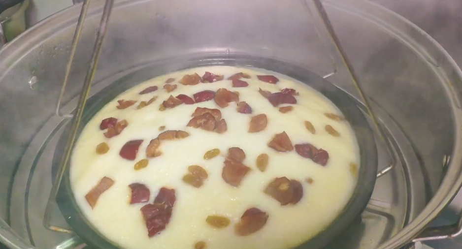 6.蒸锅中加入适量的清水,大火烧开,将米浆放入其中蒸制15分钟,15分钟后大米发糕就做好啦!