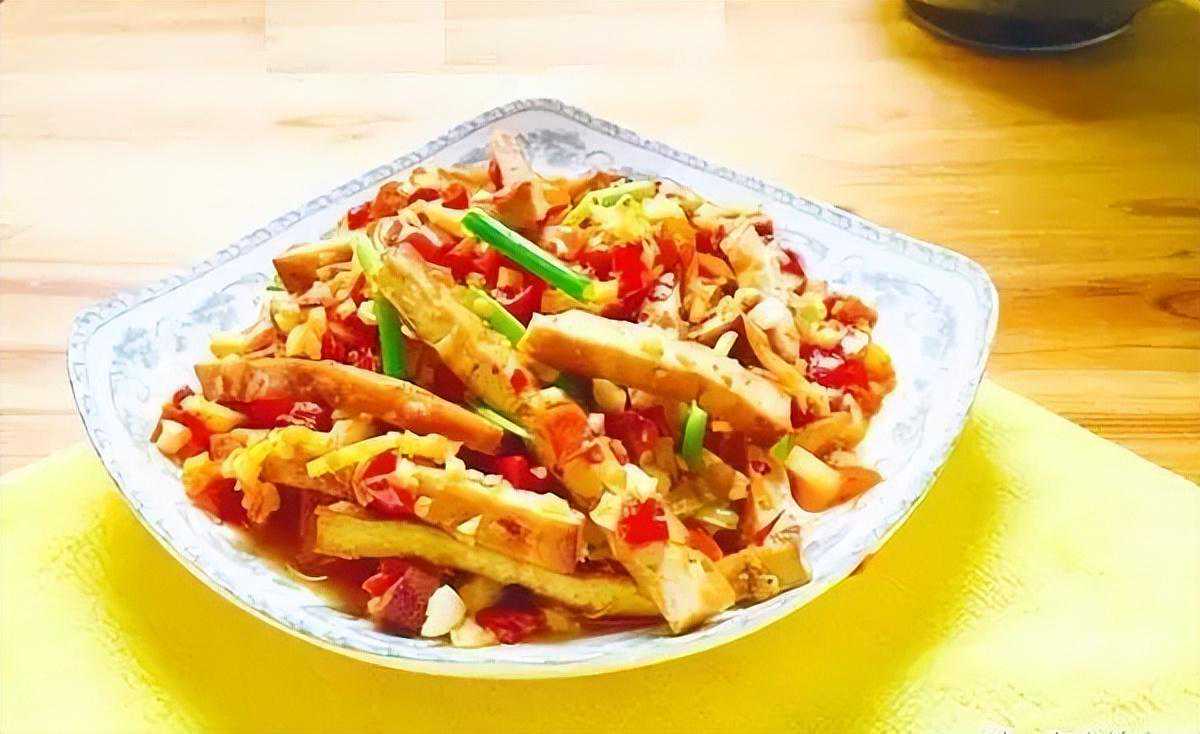 4.待辣椒开始变软,下豆干再煸炒片刻;再将下面炒好的肉丝翻炒片刻;最后下蒜片、酱油调味起锅。