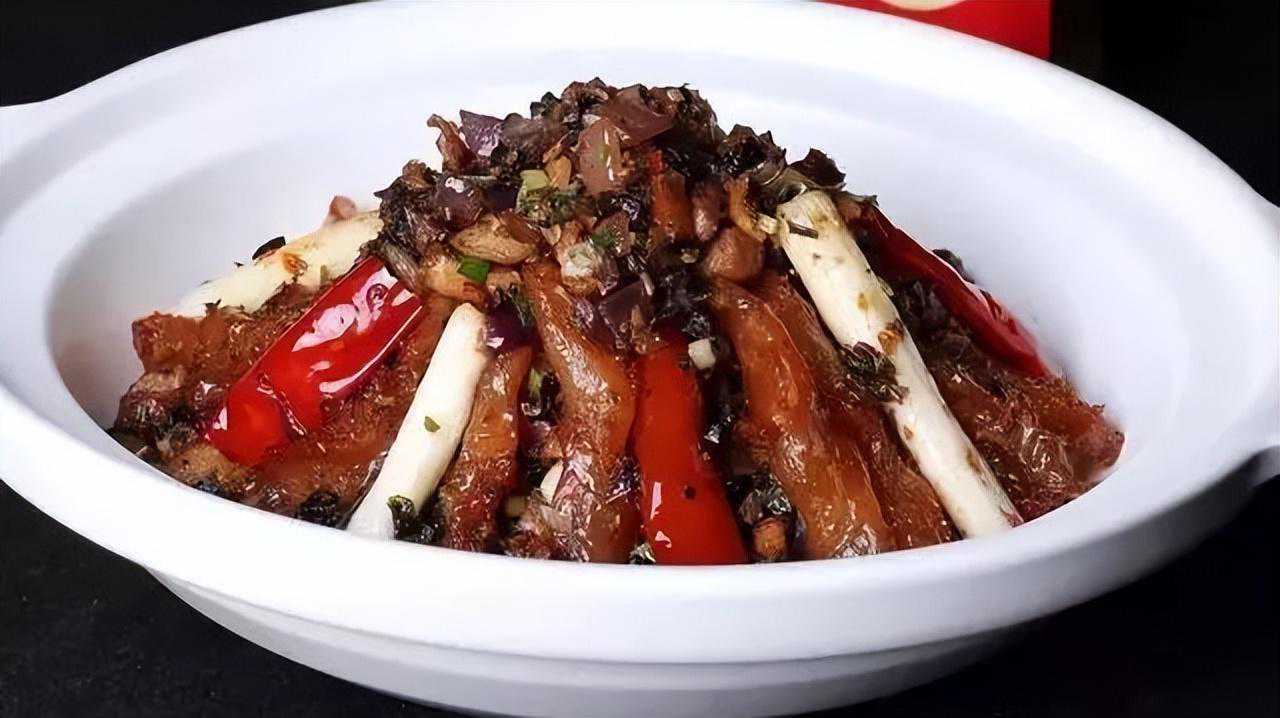 3.锅内倒油烧热,爆香豆豉、干辣椒,加味精后全部淋在腊肉上,再将腊肉隔水蒸片刻即可。