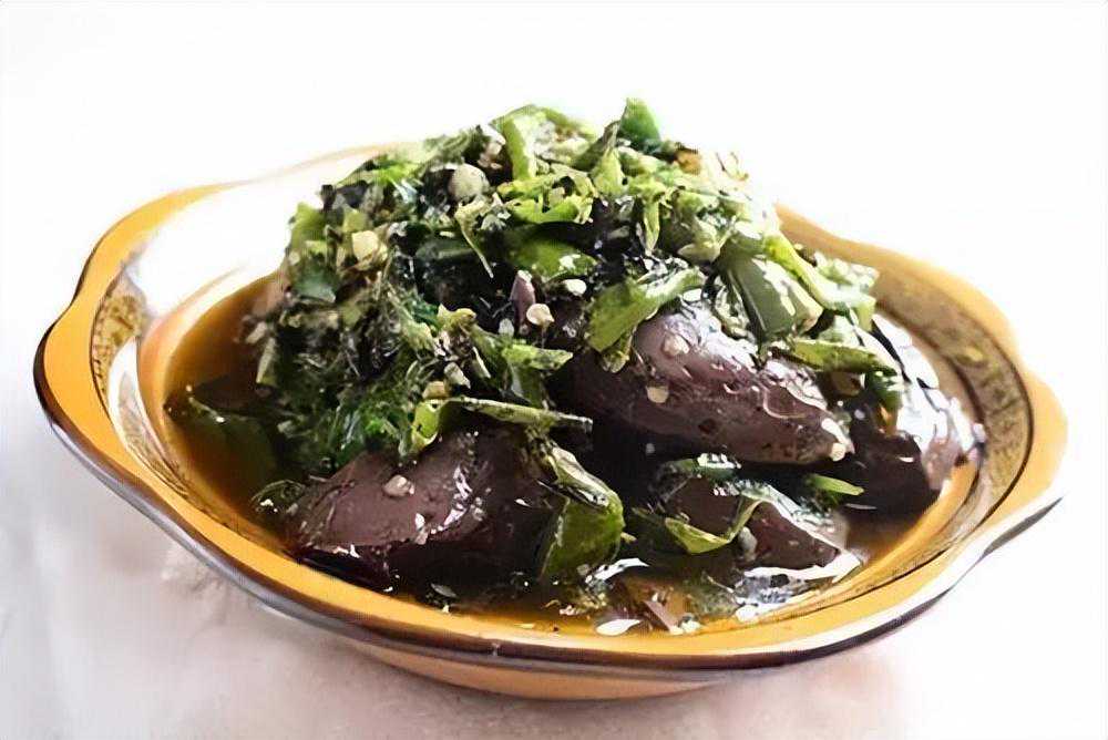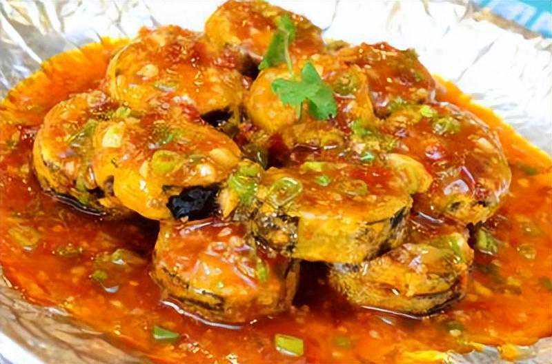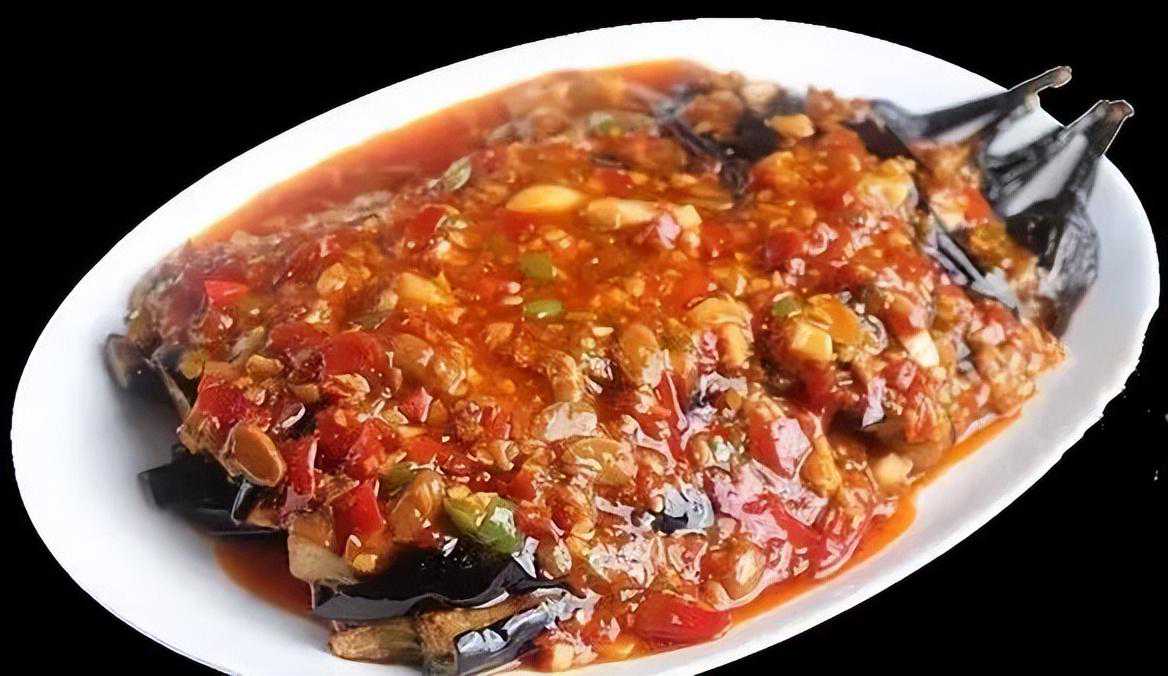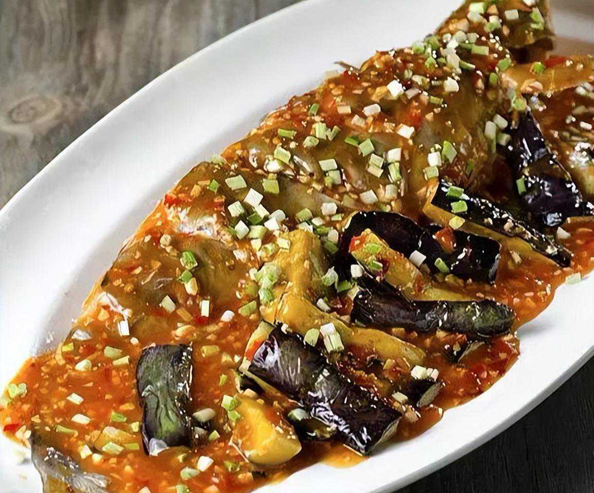 3.另锅放油烧热,先下姜米、蒜米、葱花、泡椒末炒香,掺适量鲜汤烧开后,加盐、白糖、香醋和味精调成鱼香味,把炸好的茄子下锅略烧,勾薄芡便起锅舀在盘中鱼上面,撒上葱花即成。