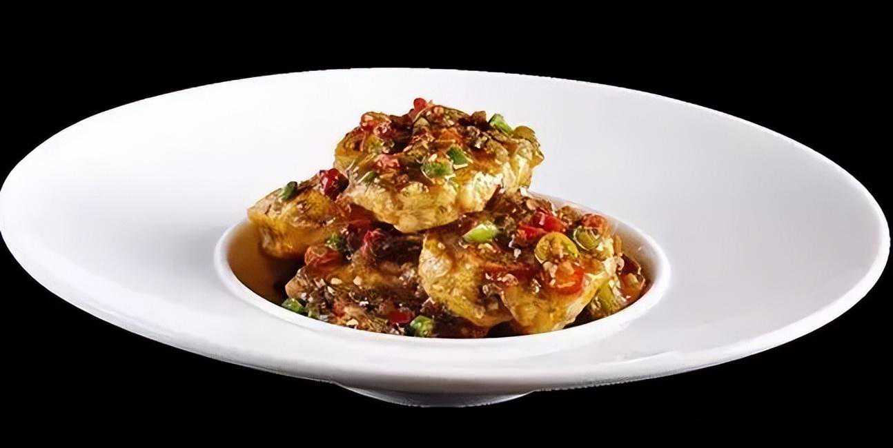 4.锅里留油,下姜蒜米,泡椒末炒香下葱花,味汁,浓稠后淋在炸好的茄饼上即可。