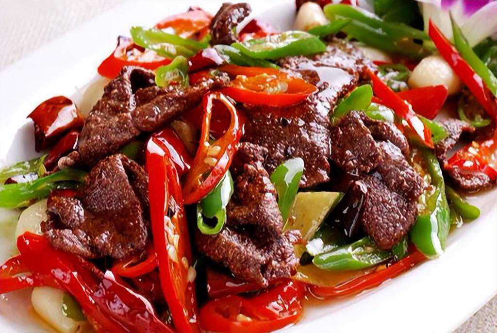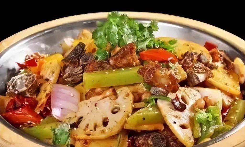 2.净锅里放猪油和菜油烧热,先下泡姜粒、泡豇豆节和蒜米爆香,再下鸡杂炒散籽,边炒边加放美人椒圈和甜椒块,放入鸭血条后烹适量清水,用胡椒粉、十三香、东古酱油、味精、白糖和盐调好味,起锅前撒入芹菜节、香菜节,装盘即成。