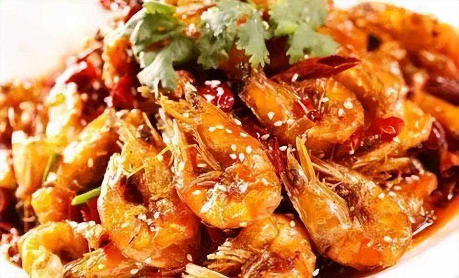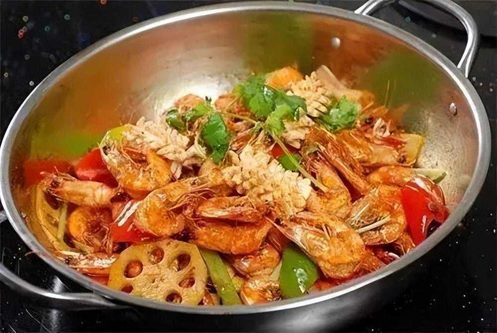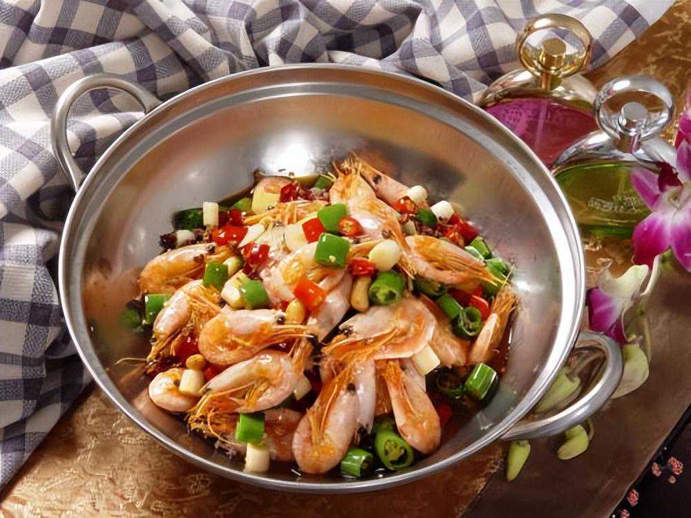 4.热锅烧油,下姜蒜米,干辣椒面,下虾,青红椒可加,调味,撒花椒面,淋香油起锅即可。